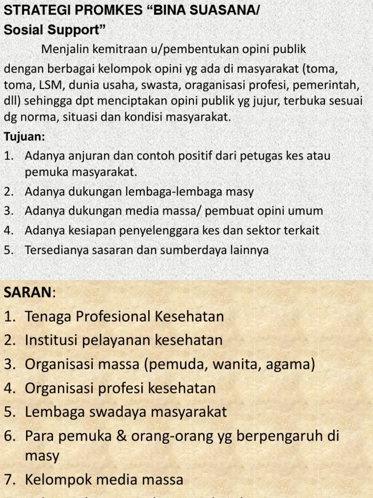 Penerapan strategi promosi kesehatan, yaitu pemberdayaan, bina suasana, dan advokasi di tatanan sarana kesehatan, khususnya puskesmas. Kesehatan dasar (dimana jika di indonesia disebut puskesmas) harus. Strategi promosi kesehatan dibagi menjadi dua yakni ada konsep dan bina suasana. Dalam upaya bina suasana atau pembentukan opini masyarakat untuk. Dalam tatanan otonomi daerah, visi indonesia sehat 2010 akan dapat dicapai.